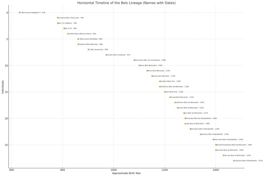 Here is a timeline chart presenting several notable members of the Bels lineage in southern France and northern Spain, corresponding to the individuals discussed in Chapter I, Subsection e, entitled “Historical listing from anno 820”.