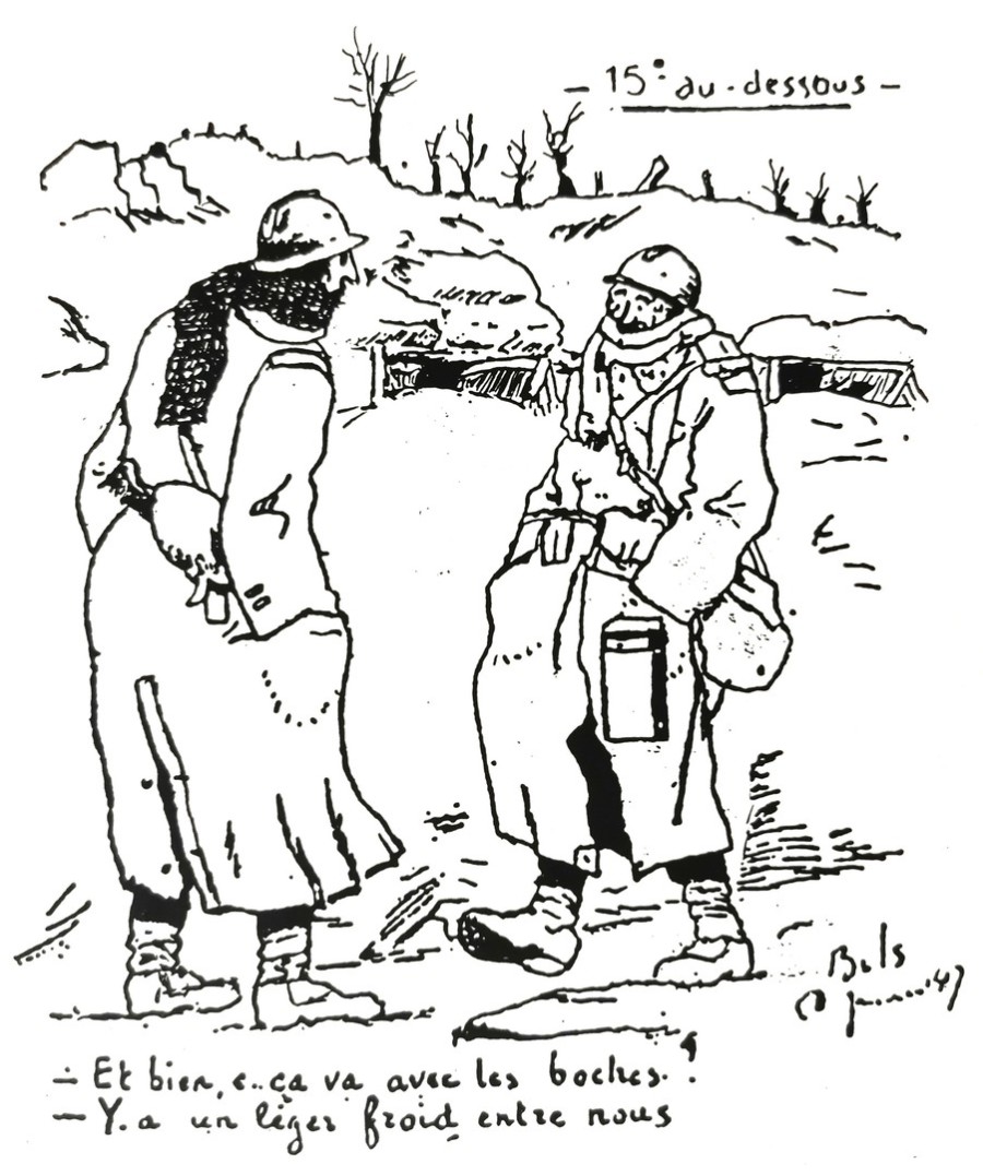 - An artist, a soldier named Bels, is the author of this humorous cartoon from either the 7th (Wednesday) or 9th (Friday) January 1914, depicting a conversation between two soldiers in the Flanders trenches on a cold winter's day (-15* CC) during the First World War. Source: Bels Archives.