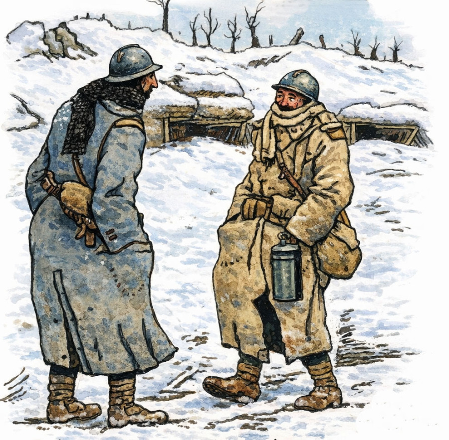 Based on the shape of the helmets, it can be inferred that the soldiers were French and not Belgian. Their helmets were identical, but the Belgians had, up front, since November 1915, the face of a Lion. “Les Capotes”, the long, double-breasted greatcoats with large lapels were typical of French infantry uniforms, especially in winter conditions. The few details in this drawing strongly suggest they are French soldiers.